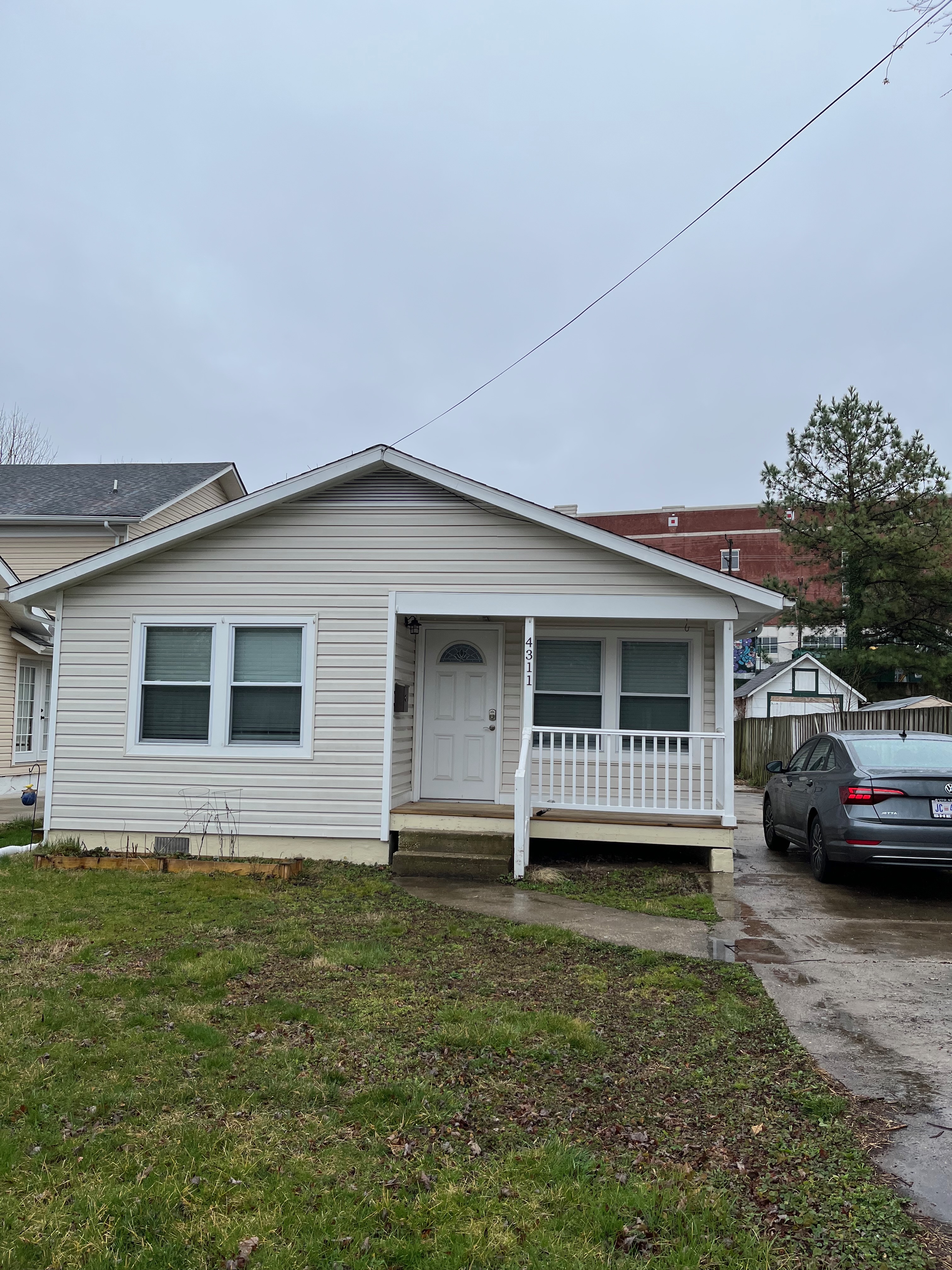 Front yard. Minimal grass, mostly weeds. Decaying flower box.