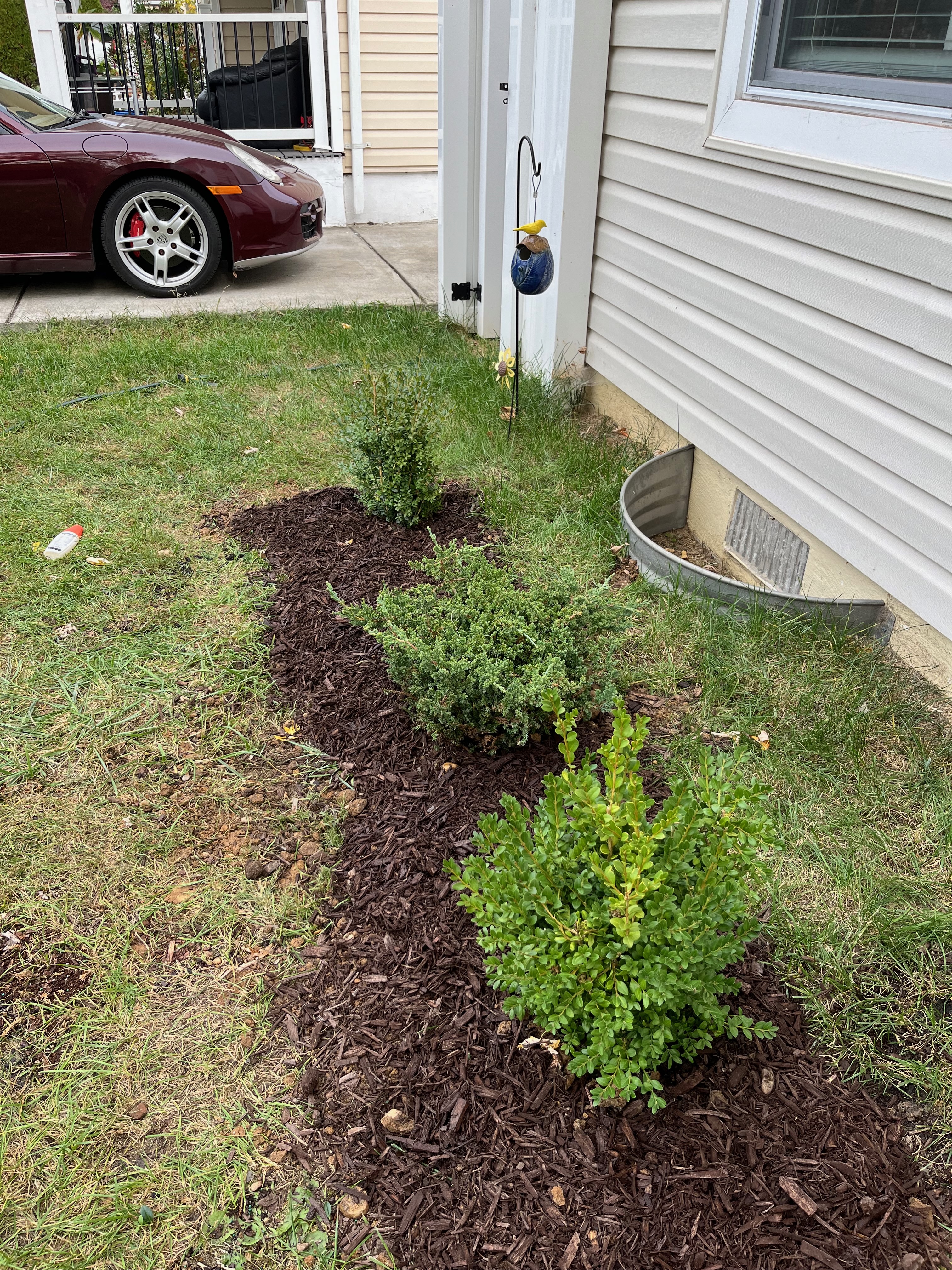 Removed the decaying flower box in the front yard and replaced it with an in-ground bed; planted some Boxwood and Juniper shrubs in it (October 2024).