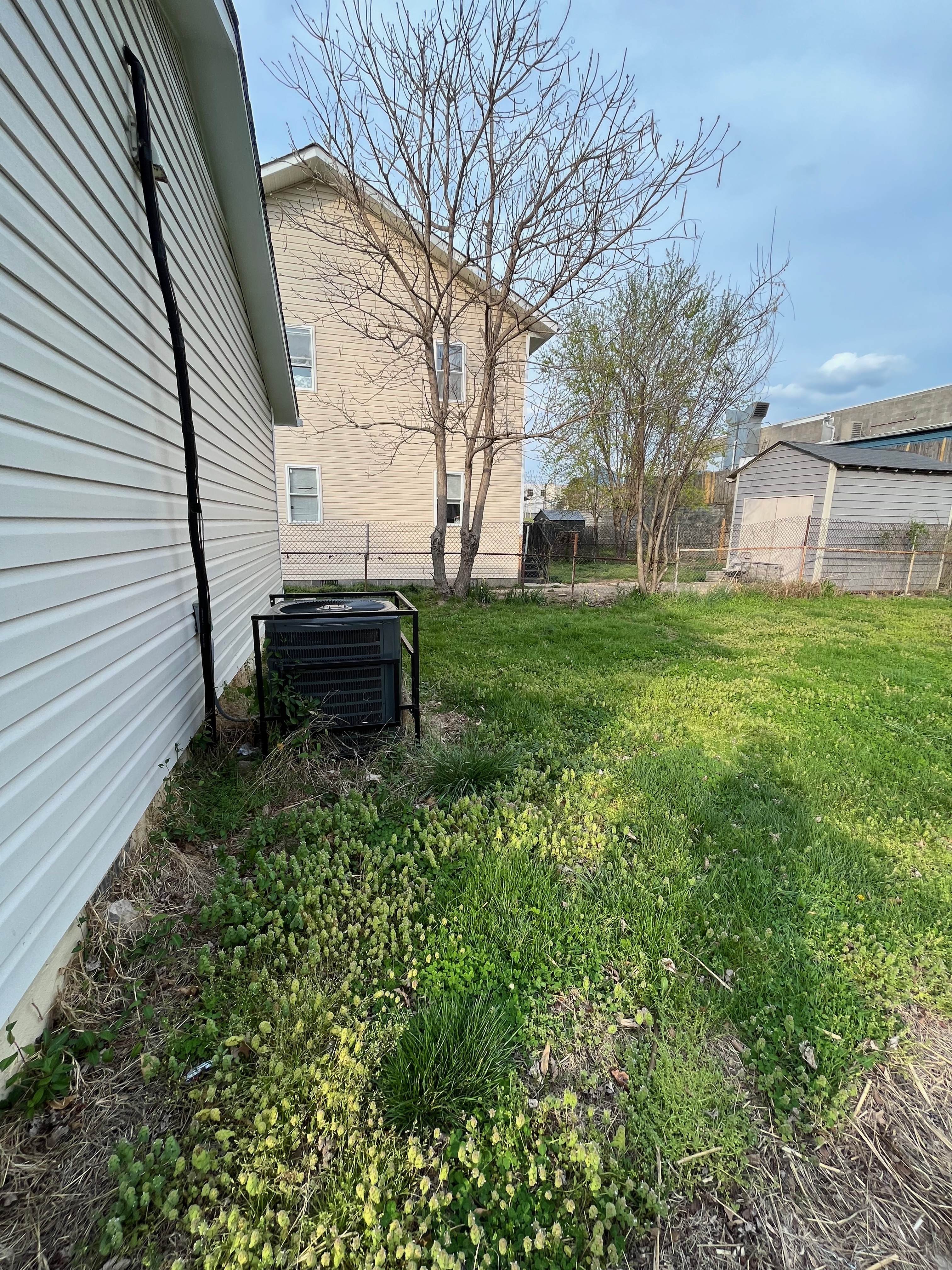 Backyard. Weeds growing into the heat pump and house siding.