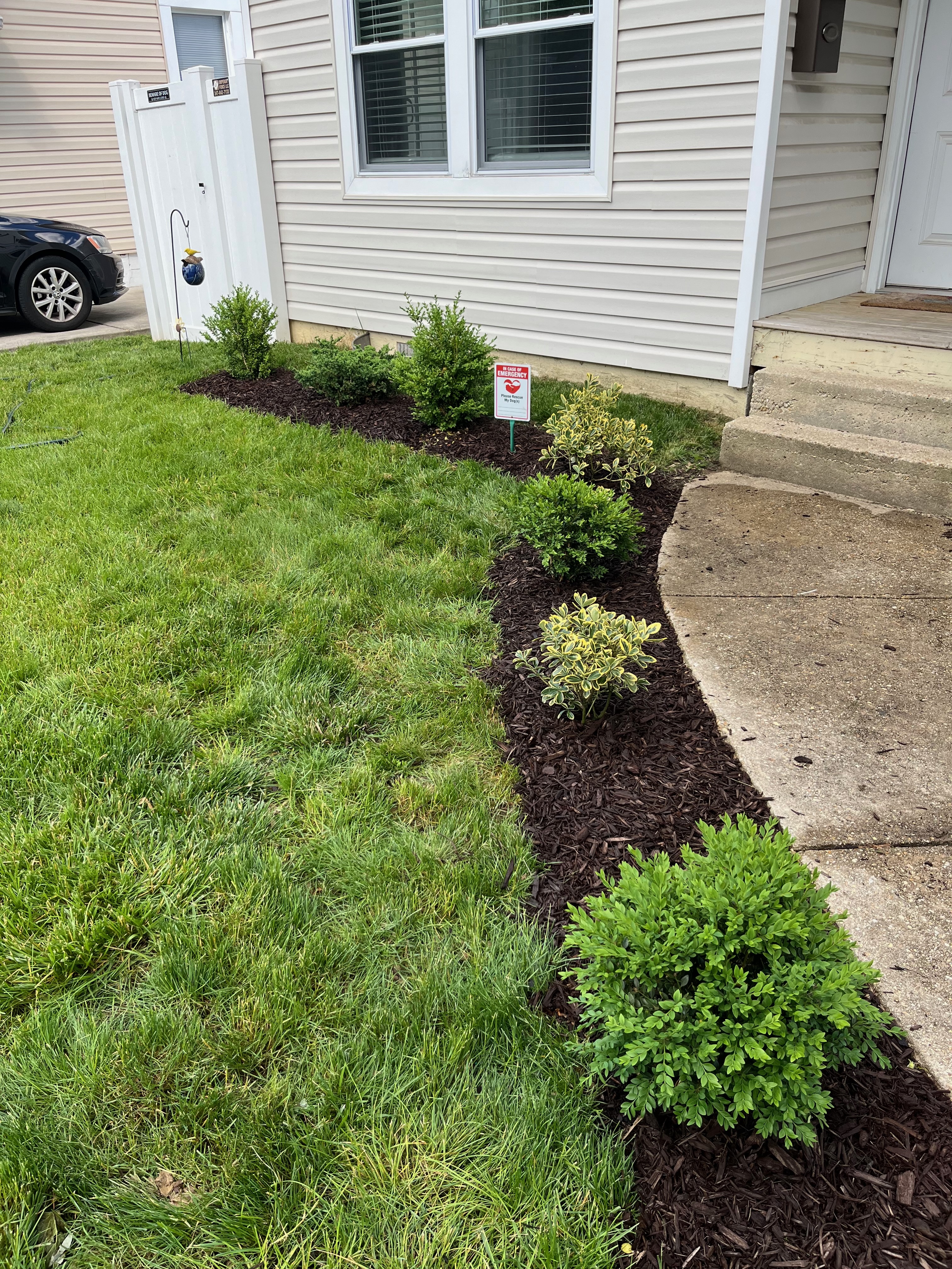 Extended the in-ground beds in the front yard to wrap around the walkway, and planted some additional Boxwood and Golden Euonymus shrubs (May 2025).